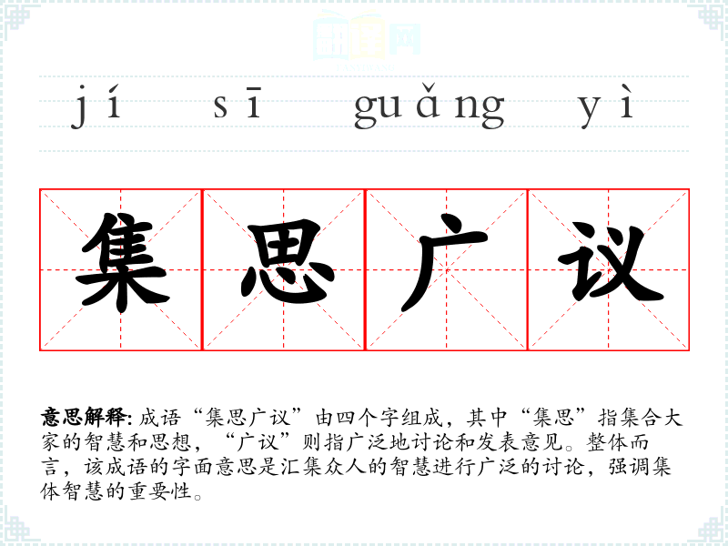 | 集思广议 | 集:聚集;思:思考,智慧;议:议论。集中众人智慧,广泛进行议论 |