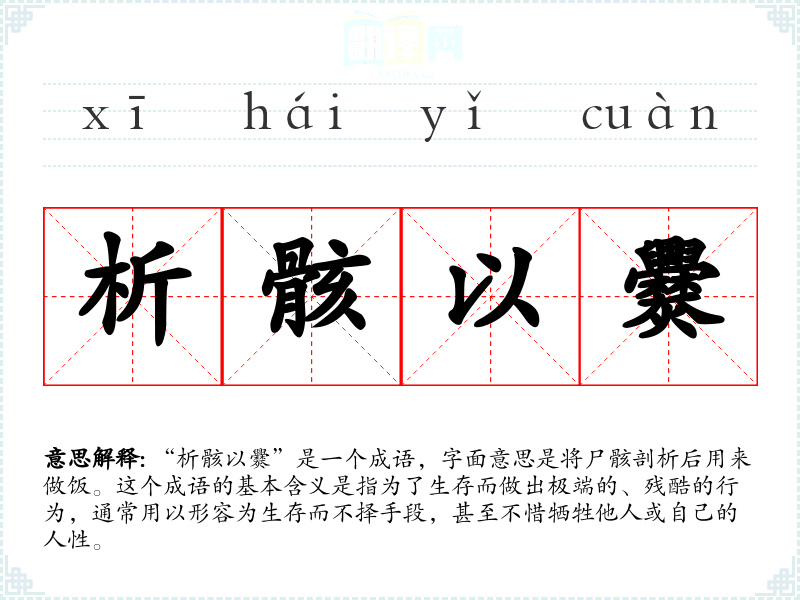 “析骸以爨”是一个成语,字面意思是将尸骸剖析后用来做饭。这个成语的基本含义是指为了生存而做出极端的、残酷的行为,通常用以形容为生存而不择手段,甚至不惜牺牲他人或自己的人性。