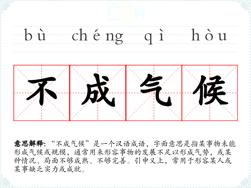 “不成气候”是一个汉语成语,字面意思是指某事物未能形成气候或规模,通常用来形容事物的发展不足以形成气势,或某种情况、局面不够成熟、不够完善。引申义上,常用于形容某人或某事缺乏实力或成就。