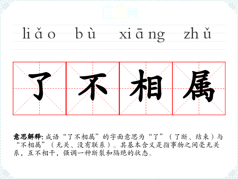 成语“了不相属”的字面意思为“了”(了断、结束)与“不相属”(无关、没有联系)。其基本含义是指事物之间毫无关系,互不相干,强调一种断裂和隔绝的状态。