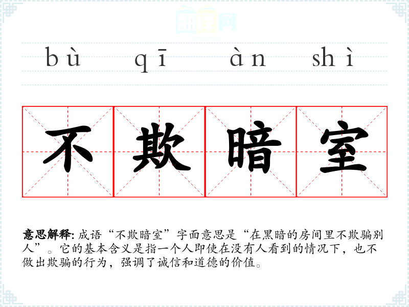 成语“不欺暗室”字面意思是“在黑暗的房间里不欺骗别人”。它的基本含义是指一个人即使在没有人看到的情况下,也不做出欺骗的行为,强调了诚信和道德的价值。