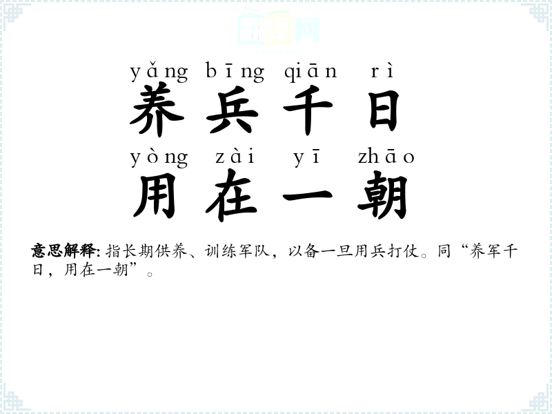 养兵:指供养训练士兵;千日:指长时间。平时供养、训练军队,以便到关键时用兵打仗 |
