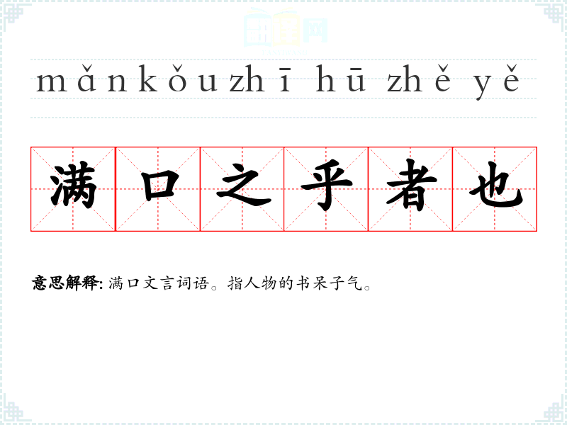 | 之乎者也 | 这四个字都是文言虚词,讽刺人说话喜欢咬文嚼字。也形容半文不白的话或文章。 |
