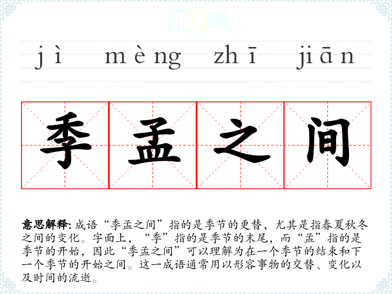 成语“季孟之间”指的是季节的更替,尤其是指春夏秋冬之间的变化。字面上,“季”指的是季节的末尾,而“孟”指的是季节的开始,因此“季孟之间”可以理解为在一个季节的结束和下一个季节的开始之间。这一成语通常用以形容事物的交替、变化以及时间的流逝。