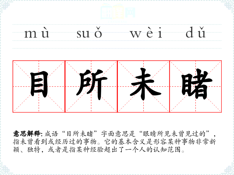 成语“目所未睹”字面意思是“眼睛所见未曾见过的”,指未曾看到或经历过的事物。它的基本含义是形容某种事物非常新颖、独特,或者是指某种经验超出了一个人的认知范围。