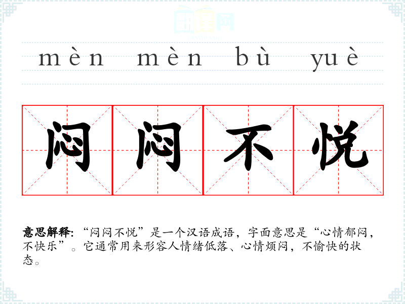 “闷闷不悦”是一个汉语成语,字面意思是“心情郁闷,不快乐”。它通常用来形容人情绪低落、心情烦闷,不愉快的状态。