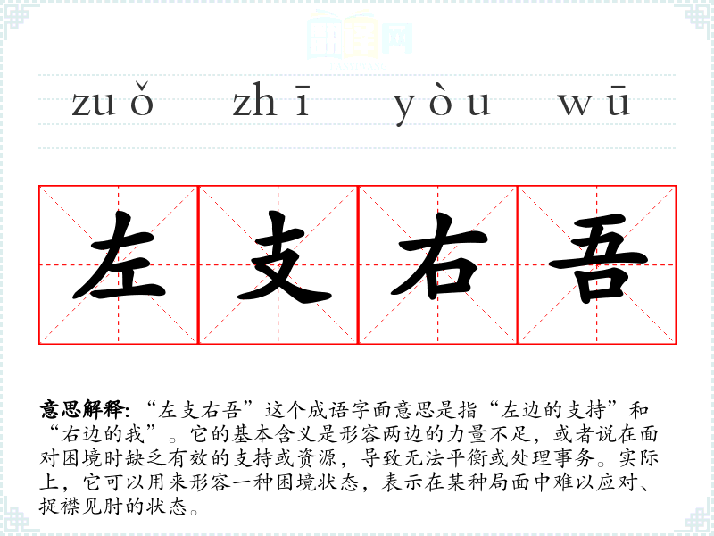 “左支右吾”这个成语字面意思是指“左边的支持”和“右边的我”。它的基本含义是形容两边的力量不足,或者说在面对困境时缺乏有效的支持或资源,导致无法平衡或处理事务。实际上,它可以用来形容一种困境状态,表示在某种局面中难以应对、捉襟见肘的状态。