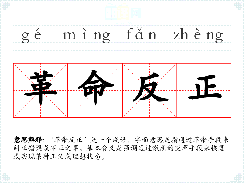 “革命反正”是一个成语,字面意思是指通过革命手段来纠正错误或不正之事。基本含义是强调通过激烈的变革手段来恢复或实现某种正义或理想状态。