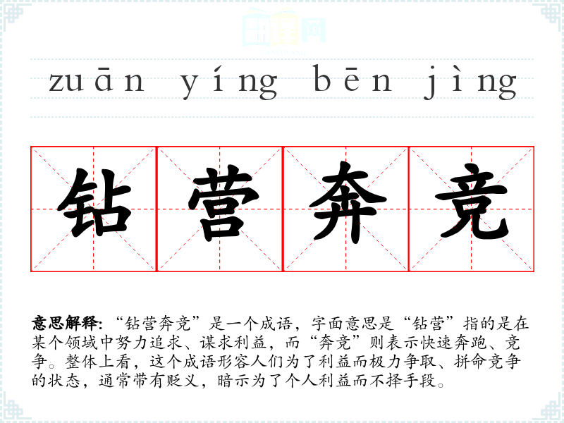“钻营奔竞”是一个成语,字面意思是“钻营”指的是在某个领域中努力追求、谋求利益,而“奔竞”则表示快速奔跑、竞争。整体上看,这个成语形容人们为了利益而极力争取、拼命竞争的状态,通常带有贬义,暗示为了个人利益而不择手段。