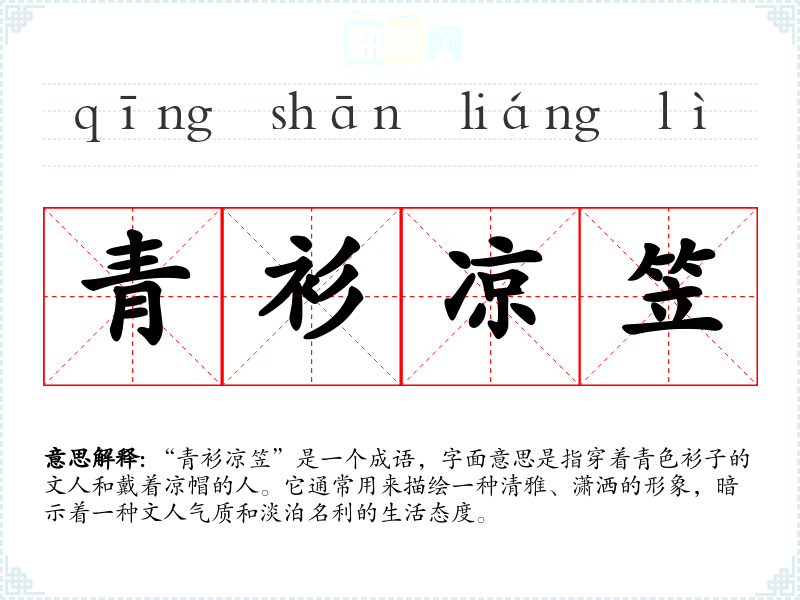 “青衫凉笠”是一个成语,字面意思是指穿着青色衫子的文人和戴着凉帽的人。它通常用来描绘一种清雅、潇洒的形象,暗示着一种文人气质和淡泊名利的生活态度。