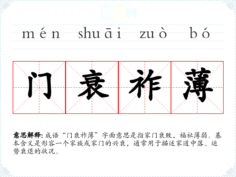 成语“门衰祚”字面意思是指家门衰败,福祉弱。基本含义是形容一个家族或家门的兴衰,通常用于描述家道中落、运势衰退的状况。