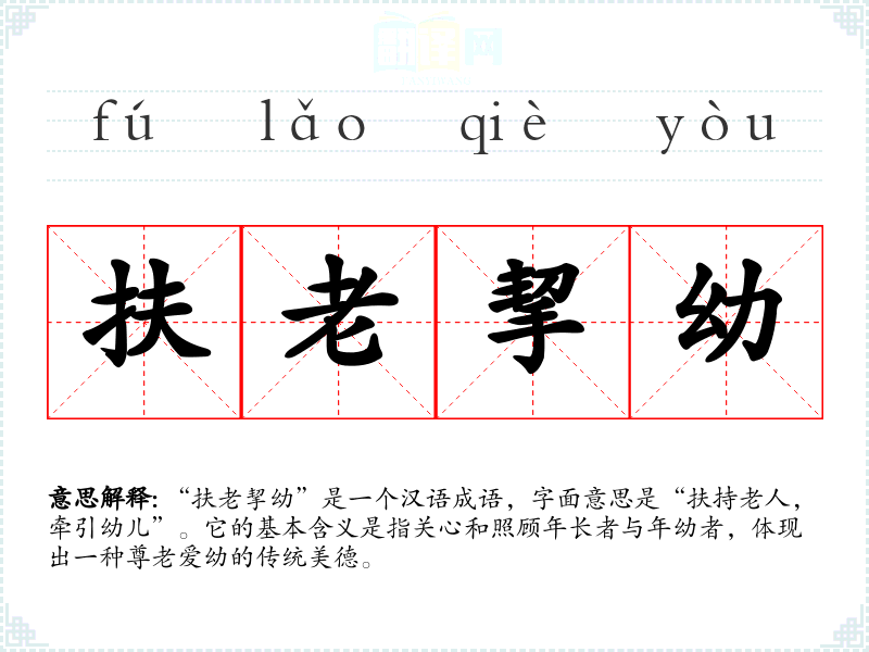 在**传统文化中,尊老爱幼是家庭和社会的重要价值观。这个成语反映了社会对家庭责任的重视,特别是在现代社会中,随着老龄化问题和儿童教育问题的日益凸显,“扶老挈幼”显得尤为重要,强调了社会成员之间的相互关爱和责任。