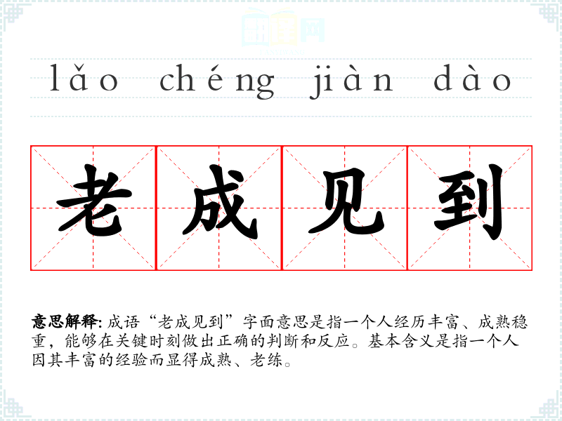 成语“老成见到”字面意思是指一个人经历丰富、成熟稳重,能够在关键时刻做出正确的判断和反应。基本含义是指一个人因其丰富的经验而显得成熟、老练。