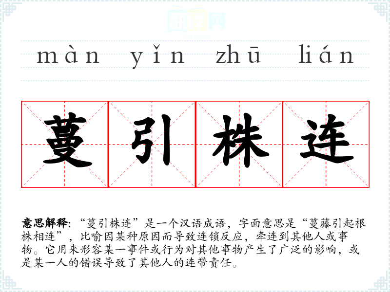 “蔓引株连”是一个富有深意的成语,它提醒我们在言行举止中要考虑到他人的感受和可能的影响。在语言学*和表达中,理解这样的成语不仅丰富了我们的词汇,也提升了我们对社会关系的敏感性。这种对连带责任的认识对个人成长和社会和谐都具有重要意义。