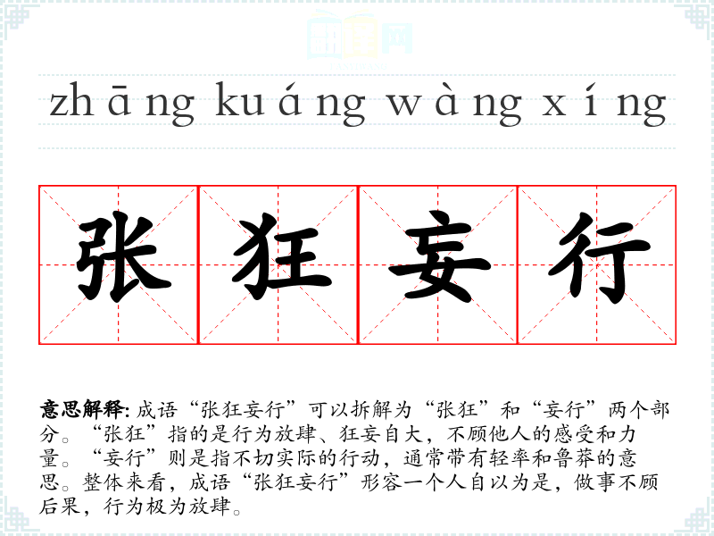 成语“张狂妄行”可以拆解为“张狂”和“妄行”两个部分。“张狂”指的是行为放肆、狂妄自大,不顾他人的感受和力量。“妄行”则是指不切实际的行动,通常带有轻率和鲁莽的意思。整体来看,成语“张狂妄行”形容一个人自以为是,做事不顾后果,行为极为放肆。