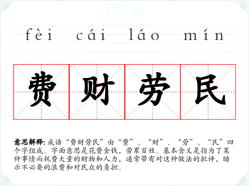 成语“费财劳民”由“费”、“财”、“劳”、“民”四个字组成。字面意思是花费金钱,劳累百姓。基本含义是指为了某种事情而耗费大量的财物和人力,通常带有对这种做法的批评,暗示不必要的浪费和对民众的负担。