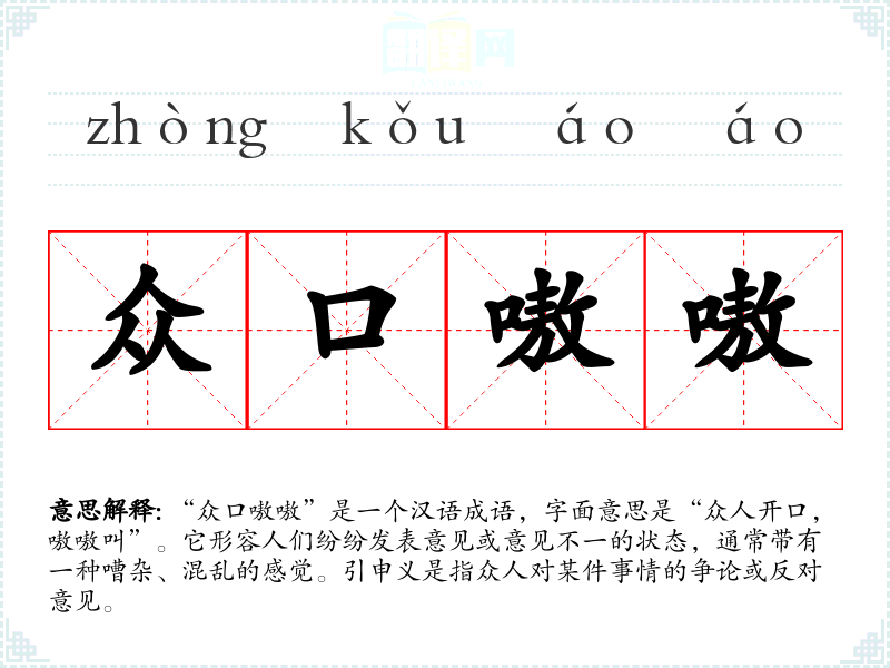 “众口嗷嗷”是一个汉语成语,字面意思是“众人开口,嗷嗷叫”。它形容人们纷纷发表意见或意见不一的状态,通常带有一种嘈杂、混乱的感觉。引申义是指众人对某件事情的争论或反对意见。