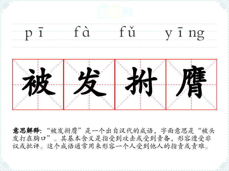 “被发拊膺”是一个出自汉代的成语,字面意思是“被头发打在胸口”。其基本含义是指受到攻击或受到责备,形容遭受非议或批评。这个成语通常用来形容一个人受到他人的指责或责难。