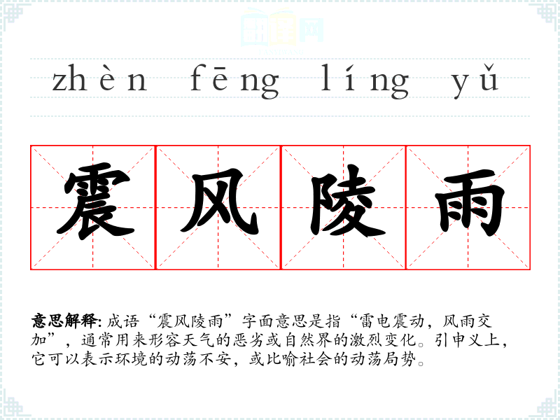 成语“震风陵雨”字面意思是指“雷电震动,风雨交加”,通常用来形容天气的恶劣或自然界的激烈变化。引申义上,它可以表示环境的动荡不安,或比喻社会的动荡局势。