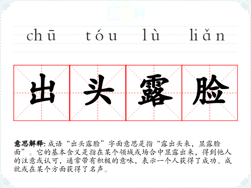 成语“出头露脸”字面意思是指“露出头来,显露脸面”。它的基本含义是指在某个领域或场合中显露出来,得到他人的注意或认可,通常带有积极的意味,表示一个人获得了成功、成就或在某个方面获得了名声。