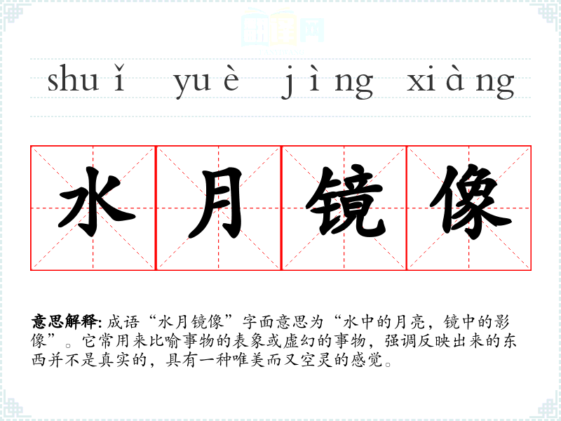 成语“水月镜像”字面意思为“水中的月亮,镜中的影像”。它常用来比喻事物的表象或虚幻的事物,强调反映出来的东西并不是真实的,具有一种唯美而又空灵的感觉。