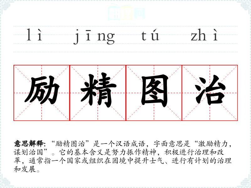 “励精图治”是一个汉语成语,字面意思是“激励精力,谋划治国”。它的基本含义是努力振作精神,积极进行治理和改革,通常指一个国家或组织在困境中提升士气、进行有计划的治理和发展。