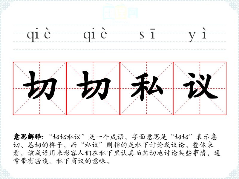 “切切私议”是一个成语,字面意思是“切切”表示急切、恳切的样子,而“私议”则指的是私下讨论或议论。整体来看,该成语用来形容人们在私下里认真而热切地讨论某些事情,通常带有密谈、私下商议的意味。