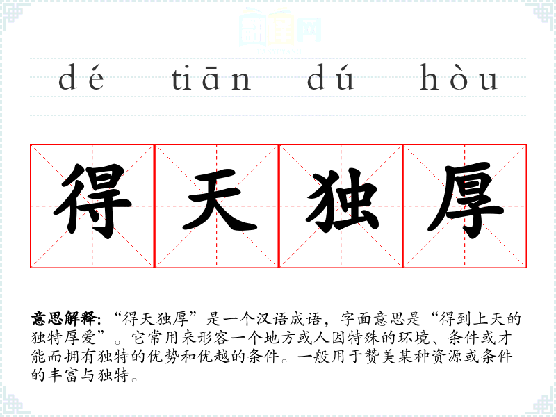 | 得天独厚 | 天:天然,自然;厚:优厚。具备的条件特别优越,所处环境特别好。 |