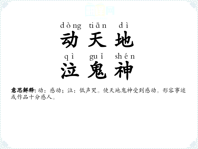 | 动天地,泣鬼神 | 动:感动;泣:低声哭。使天地鬼神受到感动。形容事迹或作品十分感人。 |