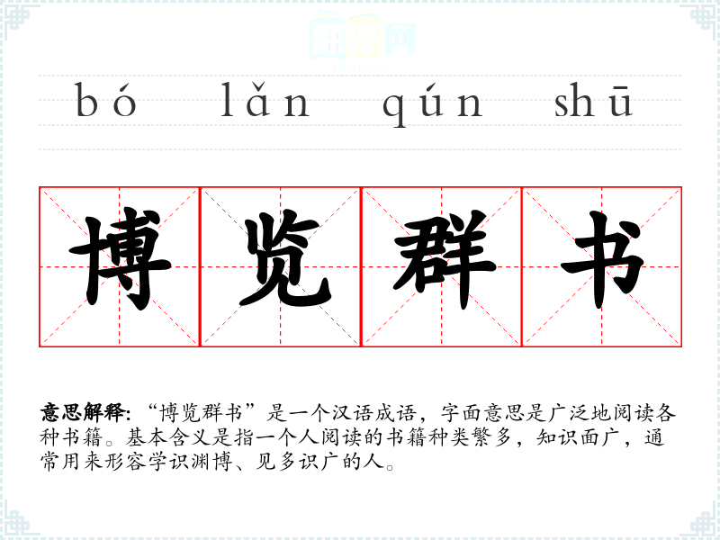 “博览群书”是一个汉语成语,字面意思是广泛地阅读各种书籍。基本含义是指一个人阅读的书籍种类繁多,知识面广,通常用来形容学识渊博、见多识广的人。