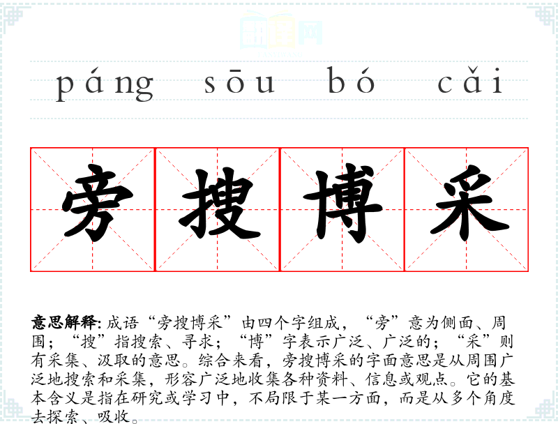 “旁搜博采”并没有明确的历史典故或文学出处,但其构成的词汇在古代文献中有广泛使用,反映了汉字文化中对广泛学和吸收的重视。它体现了古人对知识的渴望和对多元化思维的推崇,强调了在学过程中应当多方面涉猎。