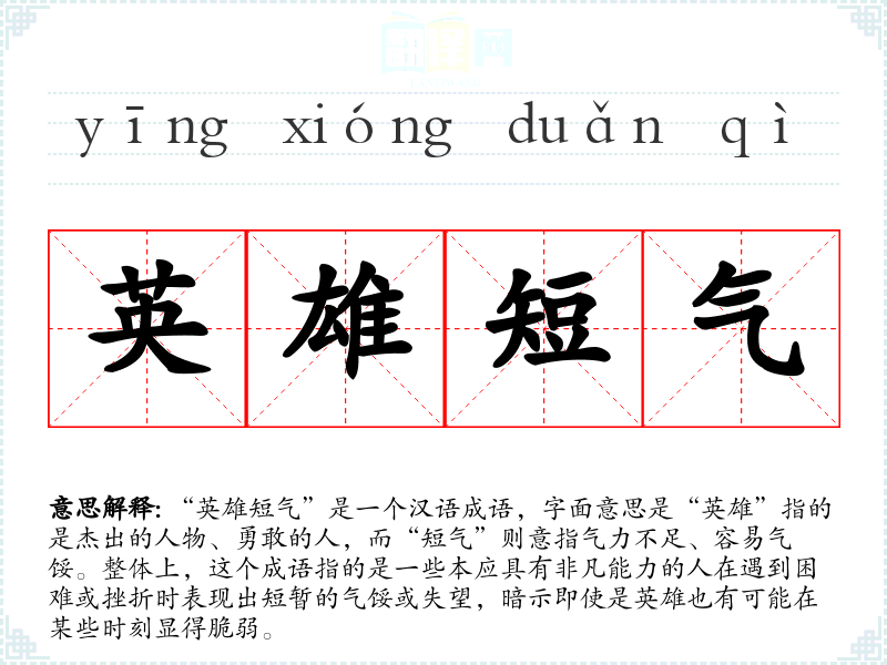 “英雄短气”是一个汉语成语,字面意思是“英雄”指的是杰出的人物、勇敢的人,而“短气”则意指气力不足、容易气馁。整体上,这个成语指的是一些本应具有非凡能力的人在遇到困难或挫折时表现出短暂的气馁或失望,暗示即使是英雄也有可能在某些时刻显得脆弱。