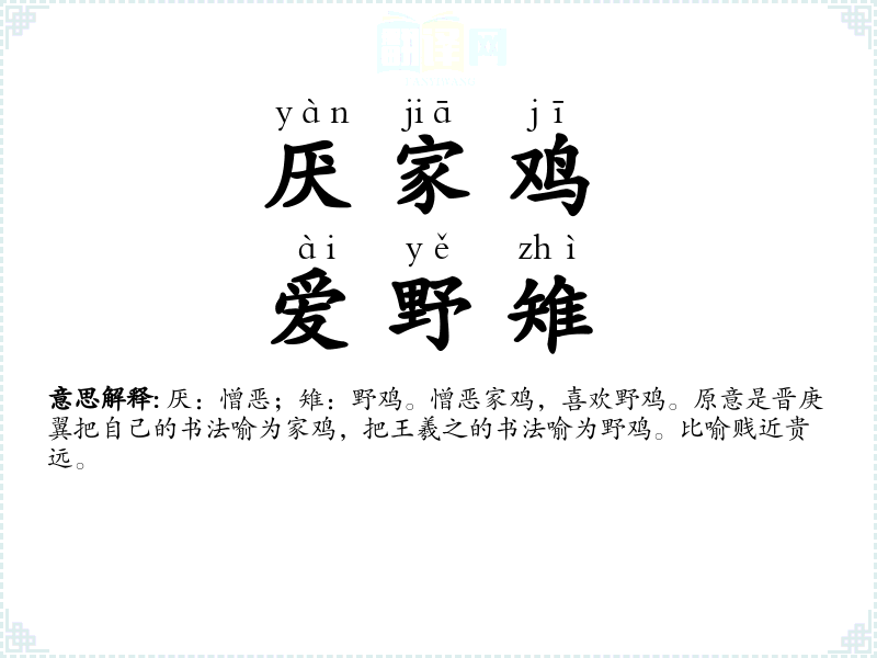 厌:憎恶;雉:野鸡。憎恶家鸡,喜欢野鸡。原意是晋庚翼把自己的书法喻为家鸡,把王羲之的书法喻为野鸡。比喻贱近贵远。