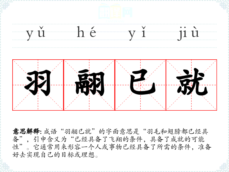 “羽翮已就”出自唐代诗人王勃的《滕王阁序》。其中提到“时维九月,序属三秋”,诗人通过描绘自然景象,借景抒情,表达了自己对人生追求的思考。成语中“羽翮”象征着飞翔的能力,而“已就”则表示这种能力已经具备,反映出一种积极向上的态度。