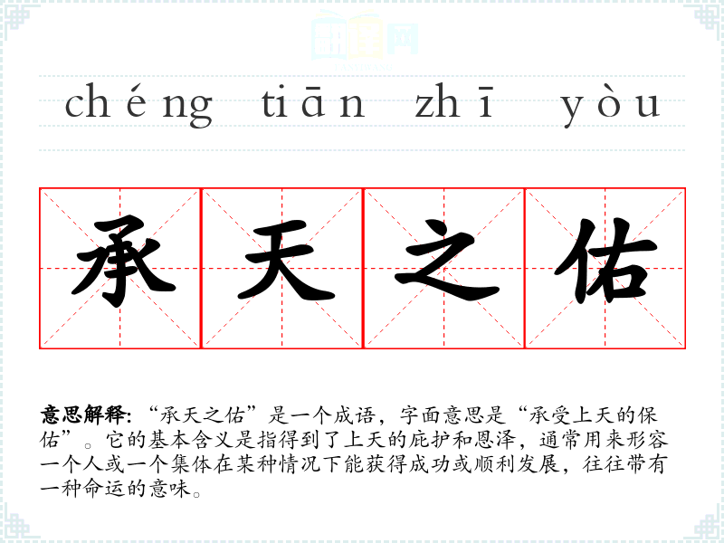 | 承天之佑 | 承:受;佑:保佑。蒙受老天的保佑。 |