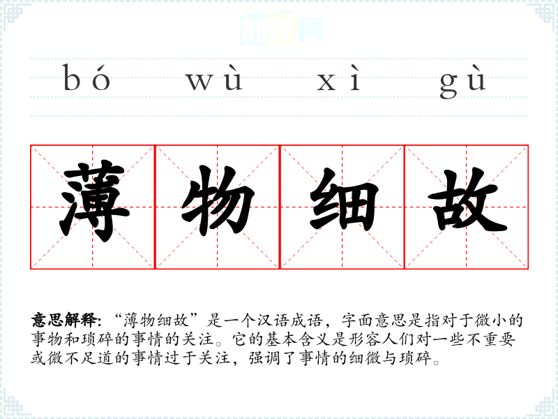 “物细故”并没有明确的历史典故或文学出处,但其构成的字词在古代文献中多有出现。成语中的“”可以理解为轻*、不重视,“物”指事物,“细”则强调小而琐碎,“故”则是事情。整体上,它反映了古人对待生活中琐事的态度,警示人们应关注更重要的事情。