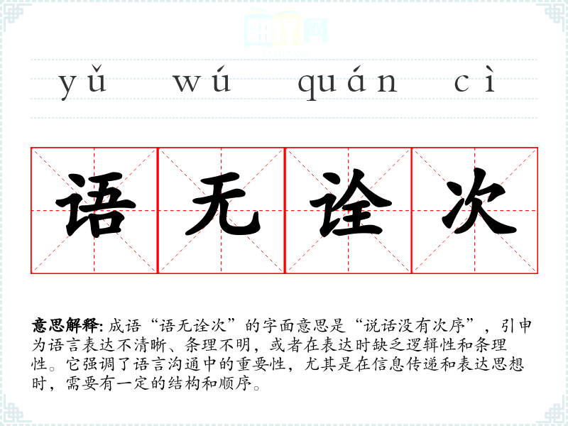 成语“语无诠次”的字面意思是“说话没有次序”,引申为语言表达不清晰、条理不明,或者在表达时缺乏逻辑性和条理性。它强调了语言沟通中的重要性,尤其是在信息传递和表达思想时,需要有一定的结构和顺序。