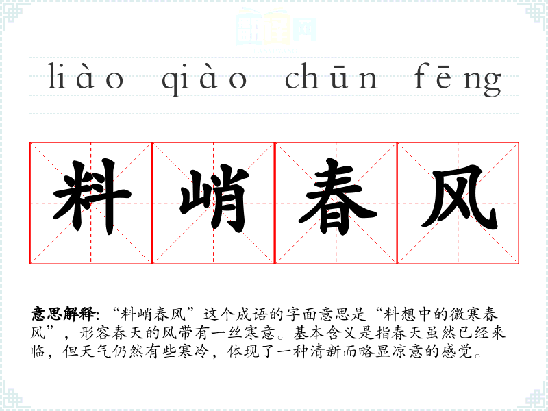 “料峭春风”这个成语的字面意思是“料想中的微寒春风”,形容春天的风带有一丝寒意。基本含义是指春天虽然已经来临,但天气仍然有些寒冷,体现了一种清新而略显凉意的感觉。