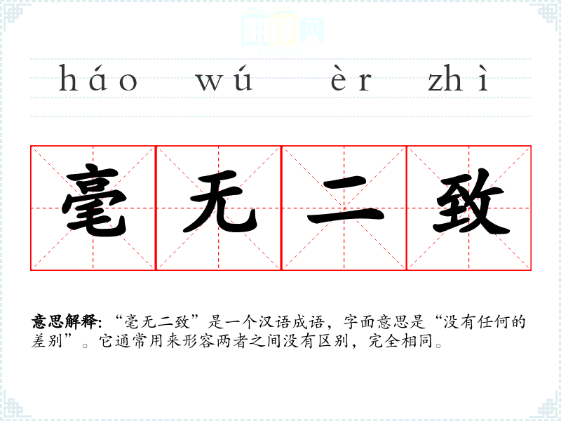 该成语的来源可以追溯到古代典籍中的表达。其构成“毫无”意为“一点也没有”,“二致”指的是“二者之间的差异”。这个成语在古代文献中并不常见,但在现代汉语中被广泛使用,尤其是在强调相似性或统一性时。