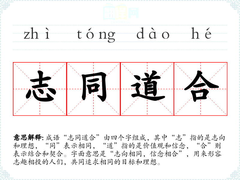 成语“志同道合”由四个字组成,其中“志”指的是志向和理想,“同”表示相同,“道”指的是价值观和信念,“合”则表示结合和契合。字面意思是“志向相同,信念相合”,用来形容志趣相投的人们,共同追求相同的目标和理想。
