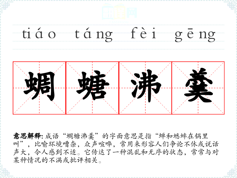 成语“蜩螗沸羹”的字面意思是指“蝉和蟋蟀在锅里叫”,比喻环境嘈杂,众声喧哗,常用来形容人们争论不休或说话声大,令人感到不适。它传达了一种混乱和无序的状态,常常与对某种情况的不满或批评相关。