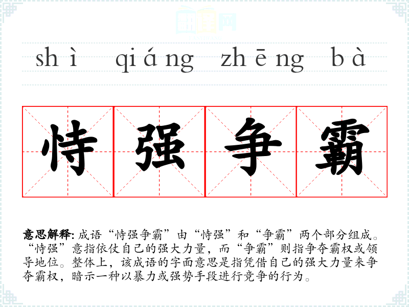 成语“恃强争霸”由“恃强”和“争霸”两个部分组成。“恃强”意指依仗自己的强大力量,而“争霸”则指争夺霸权或领导地位。整体上,该成语的字面意思是指凭借自己的强大力量来争夺霸权,暗示一种以暴力或强势手段进行竞争的行为。