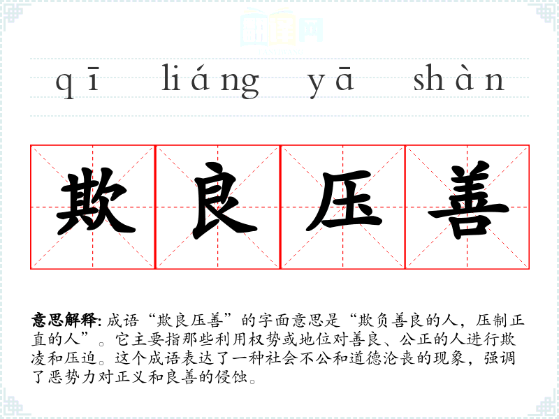 成语“欺良压善”的字面意思是“欺负善良的人,压制正直的人”。它主要指那些利用权势或地位对善良、公正的人进行欺凌和压迫。这个成语表达了一种社会不公和道德沦丧的现象,强调了恶势力对正义和良善的侵蚀。