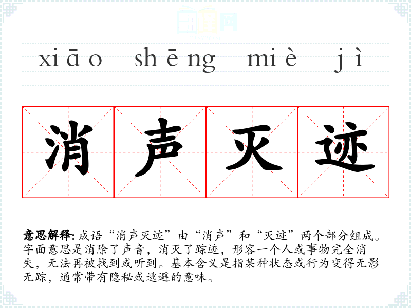 “消声灭迹”的来源并没有明确的历史文献记载,但其构成部分在古代文学中常出现。类似的表达可以追溯到古代文人对隐匿、逃避和消失的描绘,反映了古人对事物无常的哲学思考。