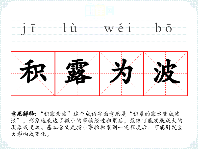 “积露为波”这个成语字面意思是“积累的露水变成波浪”,形象地表达了微小的事物经过积累后,最终可能发展成大的现象或变故。基本含义是指小事物积累到一定程度后,可能引发重大影响或变化。