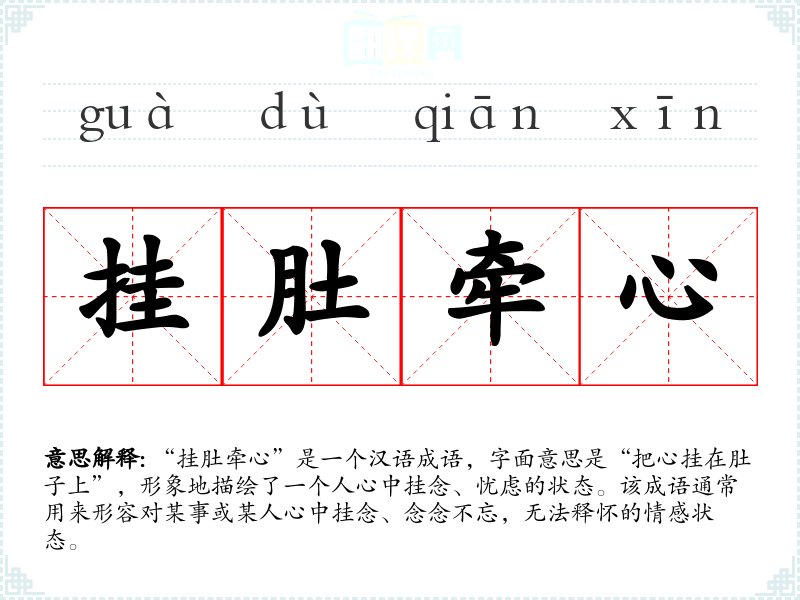 “挂肚牵心”源于古代文人对情感细腻的描写,常见于诗词和散文中。虽然具体的出处不详,但可以推测其形成与人们在情感纠葛中的心理体验有关,反映了对所思之事的深切关注和牵挂。