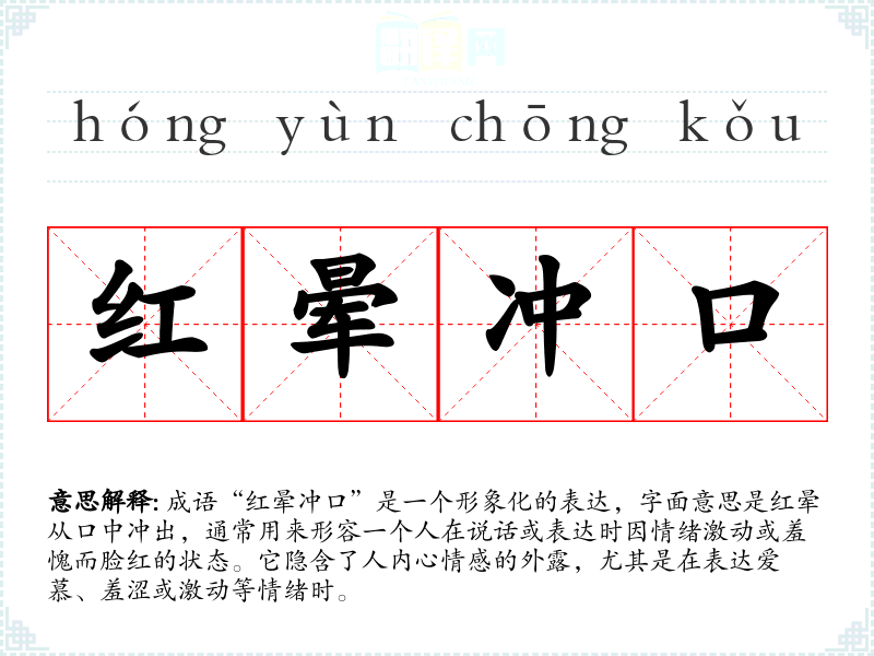 成语“红晕冲口”是一个形象化的表达,字面意思是红晕从口中冲出,通常用来形容一个人在说话或表达时因情绪激动或羞愧而脸红的状态。它隐含了人内心情感的外露,尤其是在表达爱慕、羞涩或激动等情绪时。