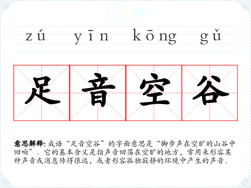 - 同义成语:空谷足音。这个成语与“足音空谷”意思相近,用于形容声音在空旷地方回响的情景。