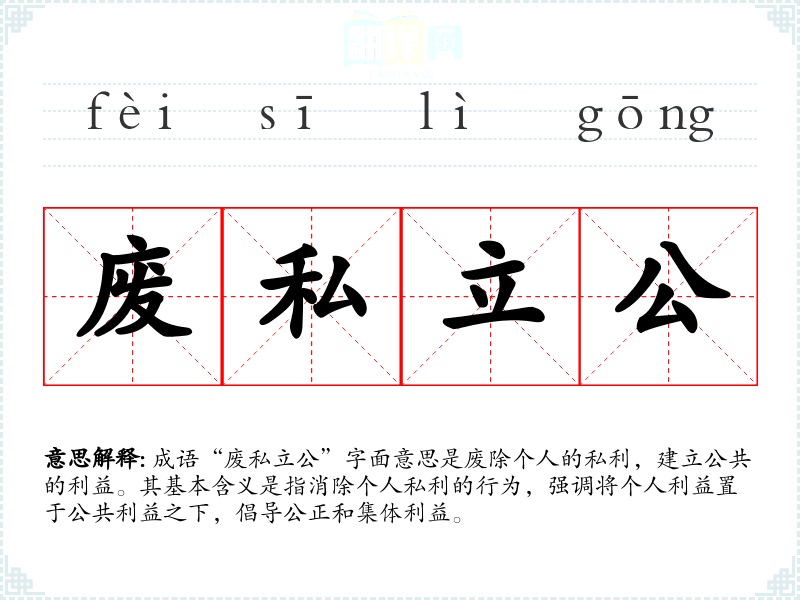 - “公而忘私”:意指在公共事务中忘记****,与“废私立公”有相似的意义。