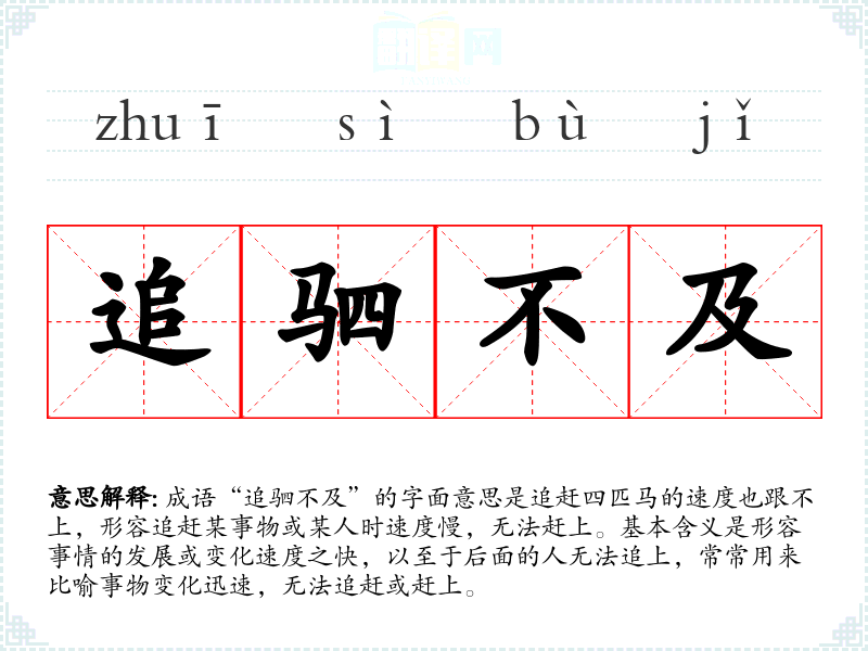 成语“追驷不及”的字面意思是追赶四匹马的速度也跟不上,形容追赶某事物或某人时速度慢,无法赶上。基本含义是形容事情的发展或变化速度之快,以至于后面的人无法追上,常常用来比喻事物变化迅速,无法追赶或赶上。